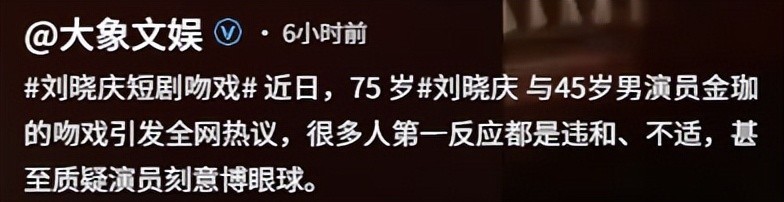 新剧惹争议 2日,刘晓庆参演的新短剧《锦绣安然》播出。 这部剧播出后,一段她和比自己岁男演员金珈的吻戏片段,直接冲上了热搜。